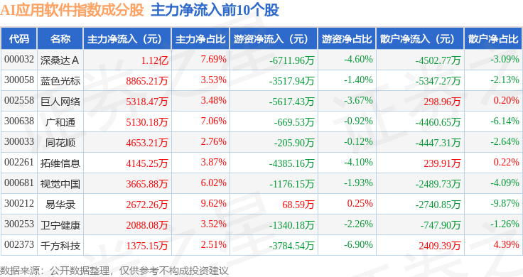 资金流向方面,AI应用软件(980107)指数成份股当日主力资金净流出合计5.54亿元,游资资金净流出合计3.64亿元,散户资金净流入合计9.18亿元。成份股资金流向详情见下表: