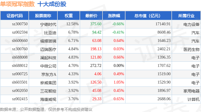 证券之星消息,12月24日,单项冠军(980150)指数报收于8076.91点,涨0.74%,成交849.9亿元,换手率1.36%。当日该指数成份股中,上涨的有38家,生益科技以10.0%的涨幅领涨,下跌的有11家,厦门钨业以4.56%的跌幅领跌。