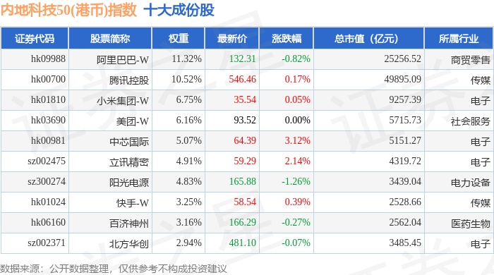 内地科技50(港币)(983004)指数十大成份股详情如下: