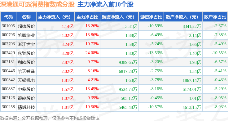 资金流向方面,深港通可选消费(983019)指数成份股当日主力资金净流入合计7.89亿元,游资资金净流出合计14.59亿元,散户资金净流入合计6.7亿元。成份股资金流向详情见下表:
