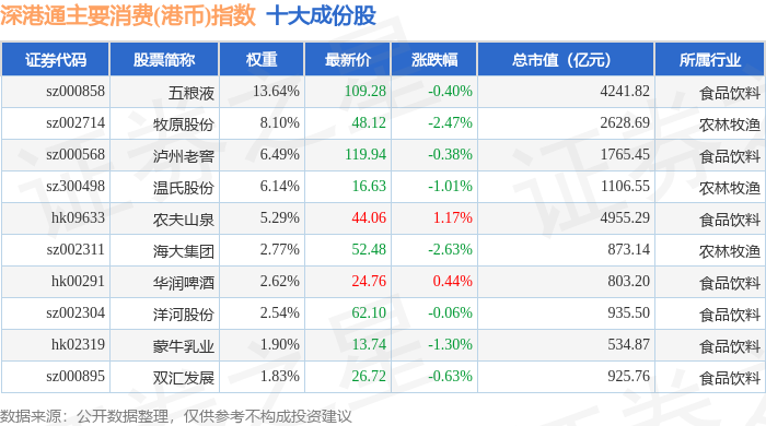 深港通主要消费(港币)(983022)指数十大成份股详情如下: