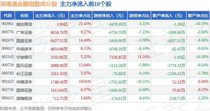 资金流向方面,深港通金融(983025)指数成份股当日主力资金净流入合计1.11亿元,游资资金净流出合计1.21亿元,散户资金净流入合计1030.05万元。成份股资金流向详情见下表: