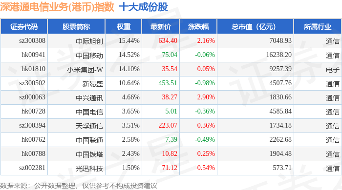 深港通电信业务(港币)(983030)指数十大成份股详情如下: