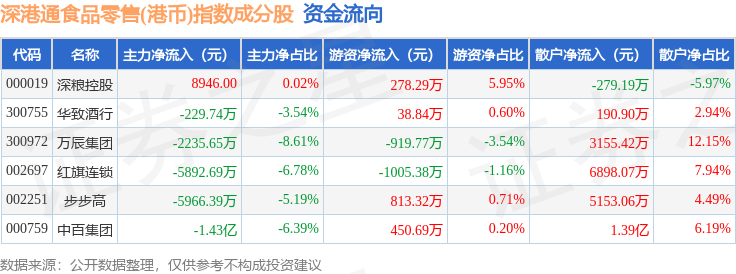 资金流向方面,深港通食品零售(港币)(983038)指数成份股当日主力资金净流出合计2.86亿元,游资资金净流出合计344.01万元,散户资金净流入合计2.9亿元。成份股资金流向详情见下表: