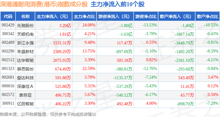 资金流向方面,深港通耐用消费(港币)(983050)指数成份股当日主力资金净流出合计2.27亿元,游资资金净流出合计5368.8万元,散户资金净流入合计2.81亿元。成份股资金流向详情见下表: