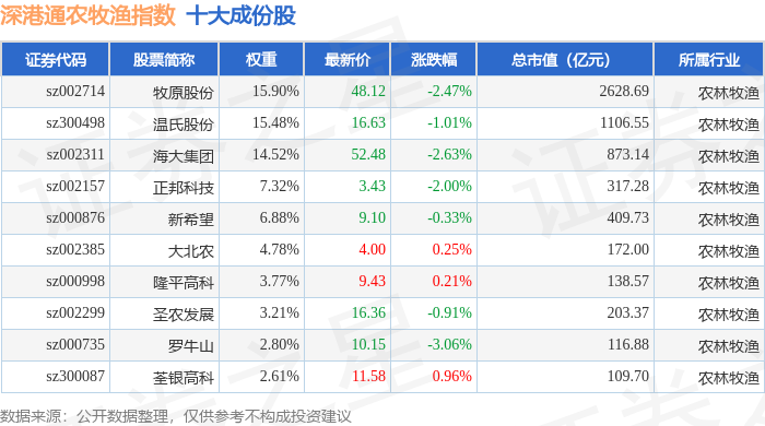 深港通农牧渔(983051)指数十大成份股详情如下: