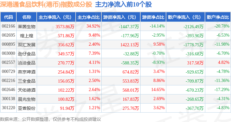 资金流向方面,深港通食品饮料(港币)(983066)指数成份股当日主力资金净流出合计6.18亿元,游资资金净流入合计4131.87万元,散户资金净流入合计5.77亿元。成份股资金流向详情见下表: