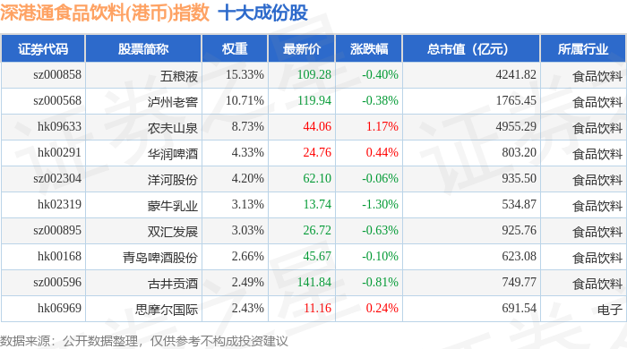 深港通食品饮料(港币)(983066)指数十大成份股详情如下: