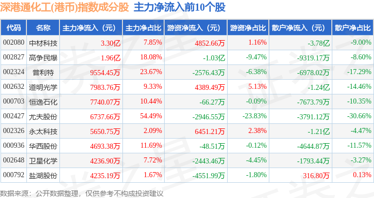 资金流向方面,深港通化工(港币)(983064)指数成份股当日主力资金净流出合计3.89亿元,游资资金净流入合计2.08亿元,散户资金净流入合计1.81亿元。成份股资金流向详情见下表:
