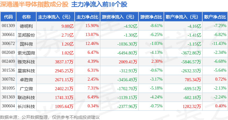 资金流向方面,深港通半导体(983067)指数成份股当日主力资金净流入合计5.84亿元,游资资金净流出合计10.84亿元,散户资金净流入合计5.0亿元。成份股资金流向详情见下表: