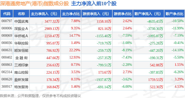 资金流向方面,深港通房地产(港币)(983072)指数成份股当日主力资金净流出合计1.6亿元,游资资金净流入合计8008.26万元,散户资金净流入合计7960.69万元。成份股资金流向详情见下表:
