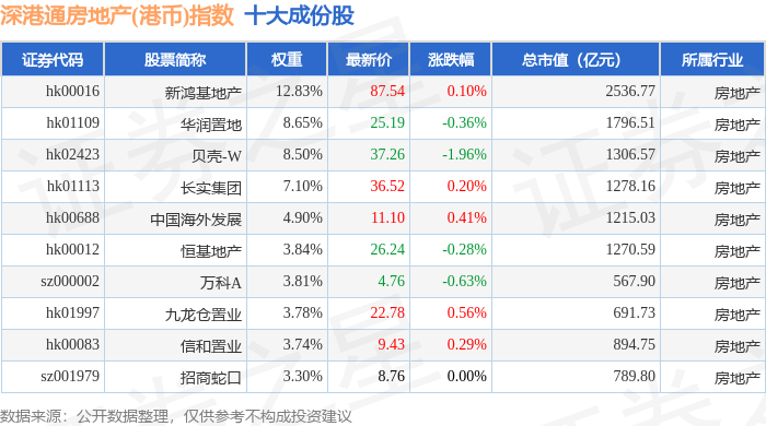 深港通房地产(港币)(983072)指数十大成份股详情如下: