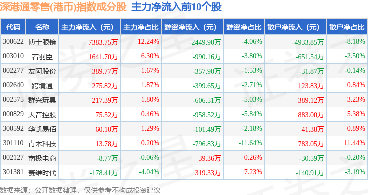 资金流向方面,深港通零售(港币)(983074)指数成份股当日主力资金净流出合计1.16亿元,游资资金净流出合计8719.12万元,散户资金净流入合计2.03亿元。成份股资金流向详情见下表: