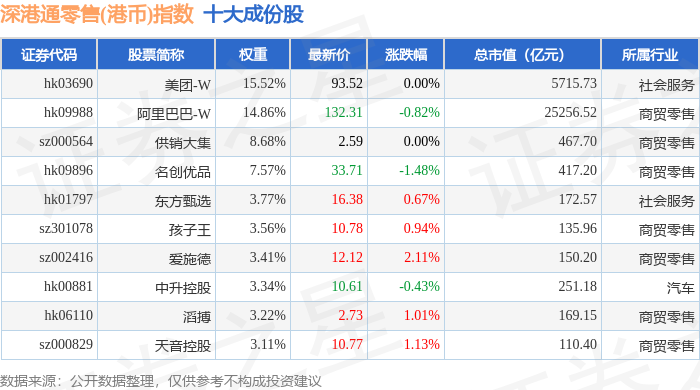 深港通零售(港币)(983074)指数十大成份股详情如下: