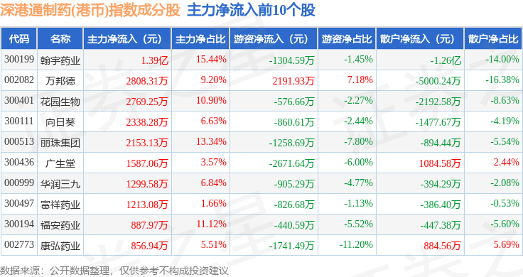 资金流向方面,深港通制药(港币)(983080)指数成份股当日主力资金净流出合计6.44亿元,游资资金净流出合计1.12亿元,散户资金净流入合计7.55亿元。成份股资金流向详情见下表:
