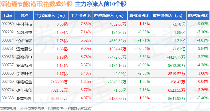 资金流向方面,深港通节能(港币)(983086)指数成份股当日主力资金净流入合计2.43亿元,游资资金净流出合计5.49亿元,散户资金净流入合计3.05亿元。成份股资金流向详情见下表: