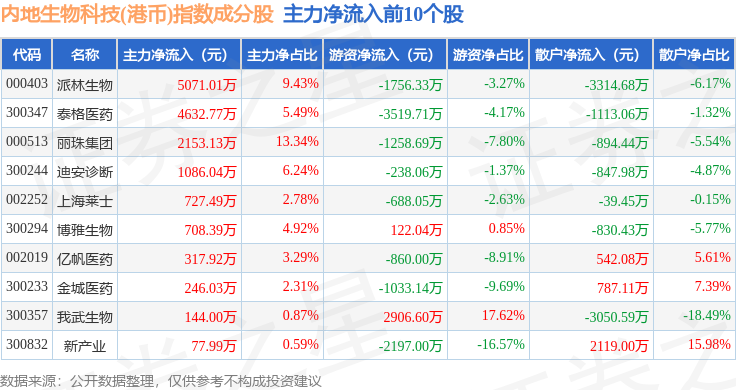 资金流向方面,内地生物科技(港币)(983102)指数成份股当日主力资金净流出合计1.3亿元,游资资金净流出合计1.12亿元,散户资金净流入合计2.42亿元。成份股资金流向详情见下表: