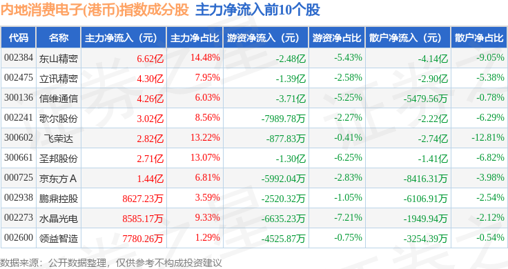 资金流向方面,内地消费电子(港币)(983106)指数成份股当日主力资金净流入合计22.55亿元,游资资金净流出合计12.66亿元,散户资金净流出合计9.89亿元。成份股资金流向详情见下表: