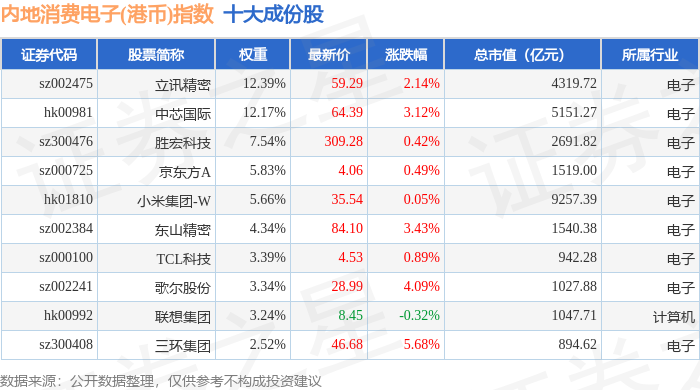 内地消费电子(港币)(983106)指数十大成份股详情如下: