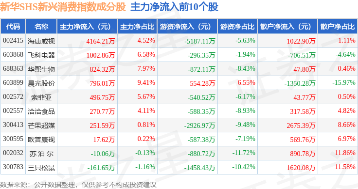 资金流向方面,新华SHS新兴消费(989006)指数成份股当日主力资金净流出合计14.9亿元,游资资金净流入合计4.22亿元,散户资金净流入合计10.68亿元。成份股资金流向详情见下表: