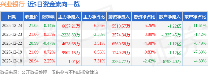 证券之星消息,截至2025年12月24日收盘,兴业银行(601166)报收于21.03元,下跌0.14%,换手率0.24%,成交量49.92万手,成交额10.49亿元。