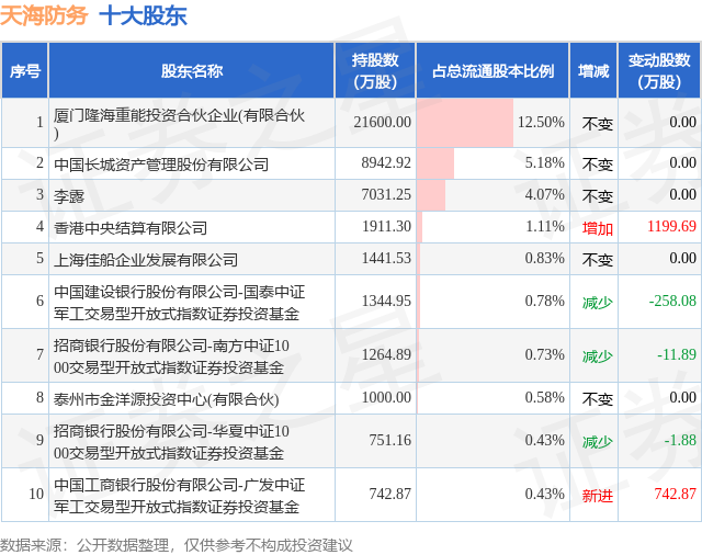 根据天海防务2025年三季报公布的十大股东详情如下: