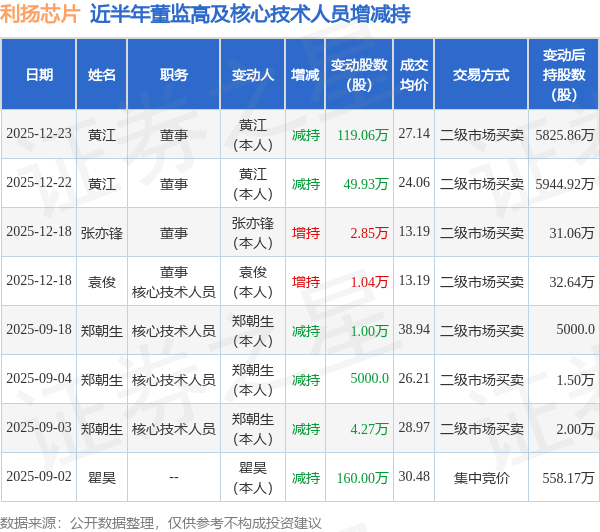 利扬芯片近半年内的董监高及核心技术人员增减持详情如下: