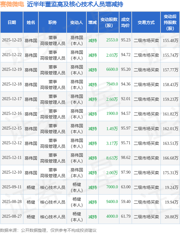 赛微微电近半年内的董监高及核心技术人员增减持详情如下: