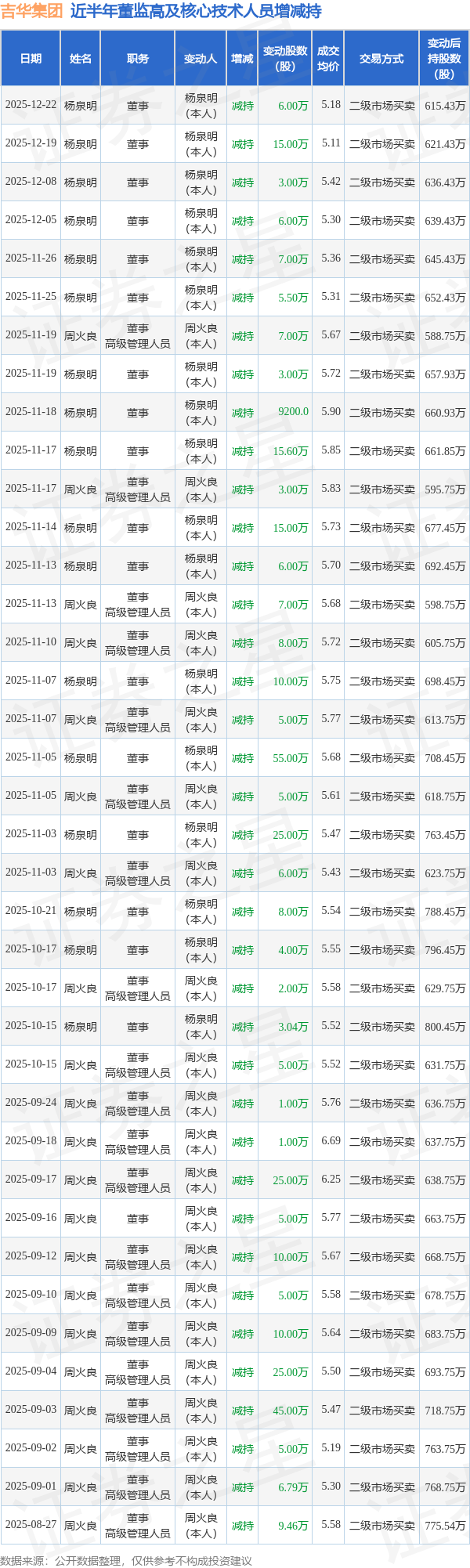 吉华集团近半年内的董监高及核心技术人员增减持详情如下: