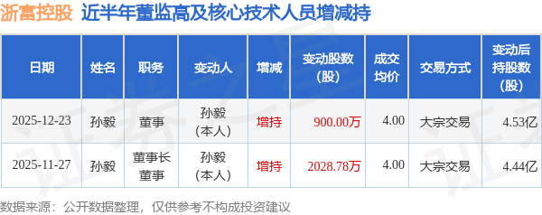 证券之星消息,根据12月24日市场公开信息、上市公司公告及交易所披露数据整理,浙富控股(002266)最新董监高及相关人员股份变动情况:2025年12月23日公司董事孙毅共增持公司股份900.0万股,占公司总股本为0.1724%。变动期间公司股价下跌0.24%,12月23日当日收盘报4.16元。