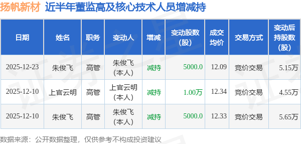 证券之星消息,根据12月24日市场公开信息、上市公司公告及交易所披露数据整理,扬帆新材(300637)最新董监高及相关人员股份变动情况:2025年12月23日公司高管朱俊飞共减持公司股份5000.0股,占公司总股本为0.0021%。变动期间公司股价上涨1.01%,12月23日当日收盘报12.0元。