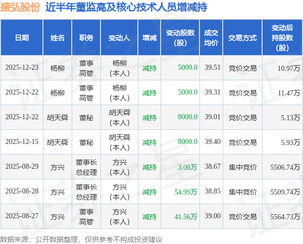 盛弘股份近半年内的董监高及核心技术人员增减持详情如下: