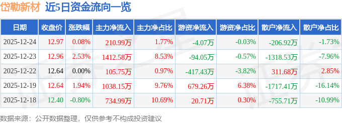 证券之星消息,截至2025年12月24日收盘,岱勒新材(300700)报收于12.97元,上涨0.08%,换手率3.41%,成交量9.24万手,成交额1.19亿元。
