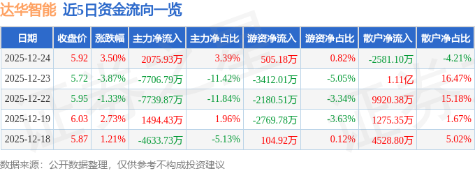 证券之星消息,截至2025年12月24日收盘,达华智能(002512)报收于5.92元,上涨3.5%,换手率9.6%,成交量105.1万手,成交额6.12亿元。
