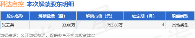 证券之星消息,根据市场公开信息整理,科达自控(920932)于12月25日将有33.08万股限售股份解禁,为公司其他类型,占公司总股本0.31%。(本次数据根据历史公告整理得出,实际情况以上市公司最新公告为准)最近一年内,该股累计解禁2.83万股,占总股本的0.03%。本次解禁后,公司还有1853.72万股限售股份,占总股本17.6%。具体如下图所示:
