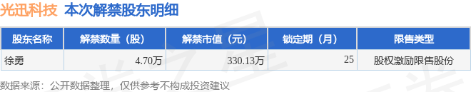 证券之星消息,根据市场公开信息整理,光迅科技(002281)于12月25日将有4.7万股限售股份解禁,为公司股权激励限售股份,占公司总股本0.01%。(本次数据根据历史公告整理得出,实际情况以上市公司最新公告为准)最近一年内,该股累计解禁645.32万股,占总股本的0.8%。本次解禁后,公司还有2719.84万股限售股份,占总股本3.37%。具体如下图所示: