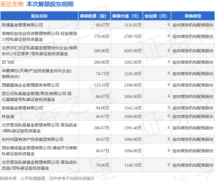 证券之星消息,根据市场公开信息整理,圣达生物(603079)于12月25日将有1784.07万股限售股份解禁,为公司定向增发机构配售股份,占公司总股本9.44%。(本次数据根据历史公告整理得出,实际情况以上市公司最新公告为准)本次解禁后,公司已无限售股份。具体如下图所示:
