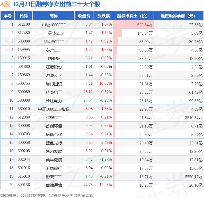 A股融券余额前三分别为:中证1000ETF(512100)融券余额24.48亿元、中证500ETF(510500)融券余额21.29亿元、中证1000(159845)融券余额4.37亿元,前20具体见下表: