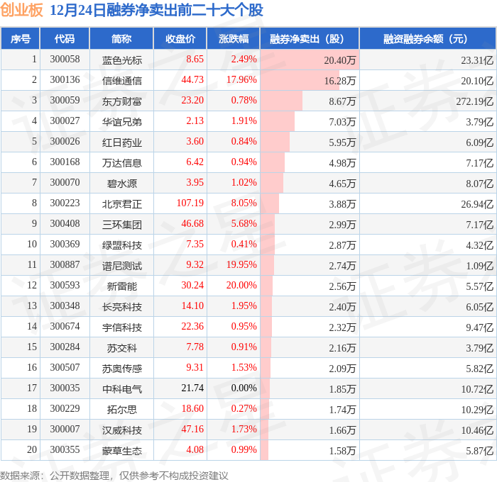 创业板融券净卖出前三分别为:蓝色光标(300058)融券净卖出20.4万股、信维通信(300136)融券净卖出16.28万股、东方财富(300059)融券净卖出8.67万股,前20具体见下表:
