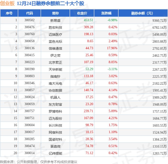 创业板融券余额前三分别为:新易盛(300502)融券余额9360.72万元、胜宏科技(300476)融券余额6782.14万元、迈瑞医疗(300760)融券余额5498.09万元,前20具体见下表: