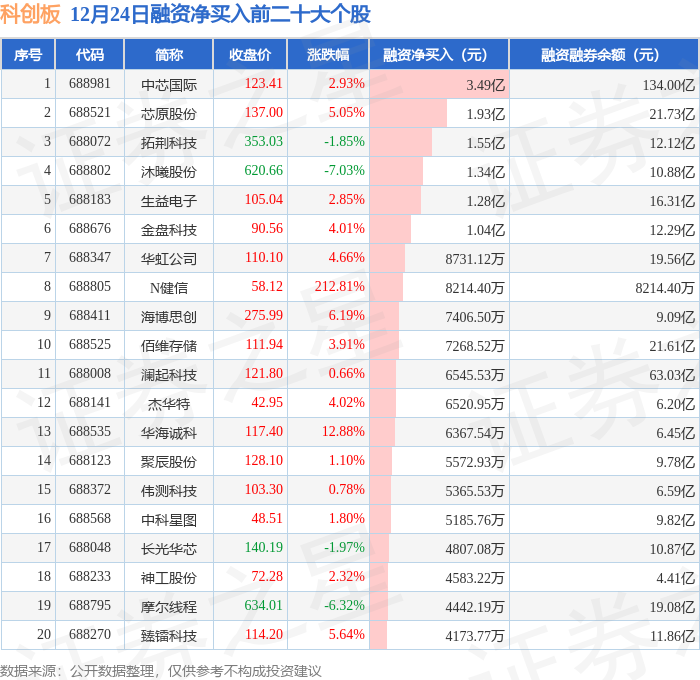 科创板融资净买入前三分别为:中芯国际(688981)融资净买入3.49亿元、芯原股份(688521)融资净买入1.93亿元、拓荆科技(688072)融资净买入1.55亿元,前20具体见下表: