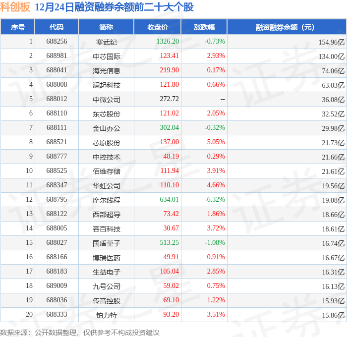 科创板融资融券余额前三分别为:寒武纪(688256)融资融券余额154.96亿元、中芯国际(688981)融资融券余额134亿元、海光信息(688041)融资融券余额74.06亿元,前20具体见下表: