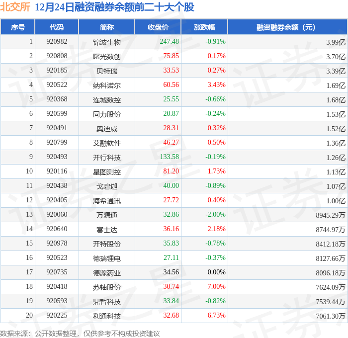 北交所融资融券余额前三分别为:锦波生物(920982)融资融券余额3.99亿元、曙光数创(920808)融资融券余额3.7亿元、贝特瑞(920185)融资融券余额3.39亿元,前20具体见下表: