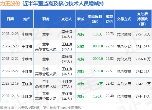 力王股份近半年内的董监高及核心技术人员增减持详情如下: