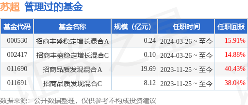 苏超女士:中国国籍,研究生、硕士。2010年6月至2014年6月在国金证券股份有限公司工作,任研究所分析师;2014年6月至2015年7月在中泰证券股份有限公司(原齐鲁证券有限公司)工作,任研究所分析师;2015年7月至2023年6月在国投瑞银基金管理有限公司工作,先后任研究部高级研究员、基金经理助理;2023年6月加入招商基金管理有限公司。2023年11月25日担任招商品质发现混合型证券投资基金基金经理。2024年3月26日起担任招商丰盛稳定增长灵活配置混合型证券投资基金基金经理。