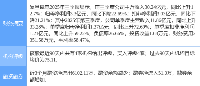 2025年11月10日,太平洋研究员张世杰,李珏晗发布了对复旦微电的研报《Q3业绩大幅提升,FPGA业务持续成长》,该研报对复旦微电给出“买入”评级。研报中预计2025-2027年营业总收入分别为41.19、48.90、58.01亿元,同比增速分别为14.73%、18.72%、18.61%;归母净利润分别为6.41、10.08、13.74亿元,同比增速分别为11.98%、57.26%、36.23%,对应25-27年PE分别为74X、47X、35X,维持“买入”评级。证券之星数据中心根据近三年发布的研报数据计算,该研报作者对此股的盈利预测准确度为18.9%。