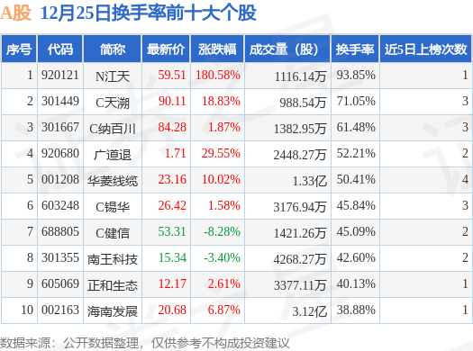 当日A股换手率前10大个股中8只个股收涨,平均涨幅31.49%,其中N江天(920121)以换手率93.85%排第一,7只个股近5个交易日中多次上榜。