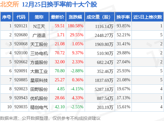 当日北交所换手率前10大个股中7只个股收涨,平均涨幅32.51%,其中N江天(920121)以换手率93.85%排第一,8只个股近5个交易日中多次上榜。