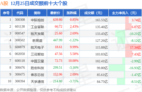 当日A股成交额前10大个股中7只个股收涨,平均涨幅4.79%,其中中际旭创(300308)以成交额165.55亿元排第一。从主力资金流入看,成交额前10大个股中有4只个股呈现主力资金净流入。