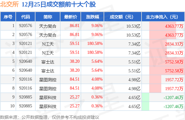 当日北交所成交额前10大个股全线收涨,平均涨幅39.94%,其中天力复合(920576)以成交额10.53亿元排第一。从主力资金流入看,成交额前10大个股中有8只个股呈现主力资金净流入。